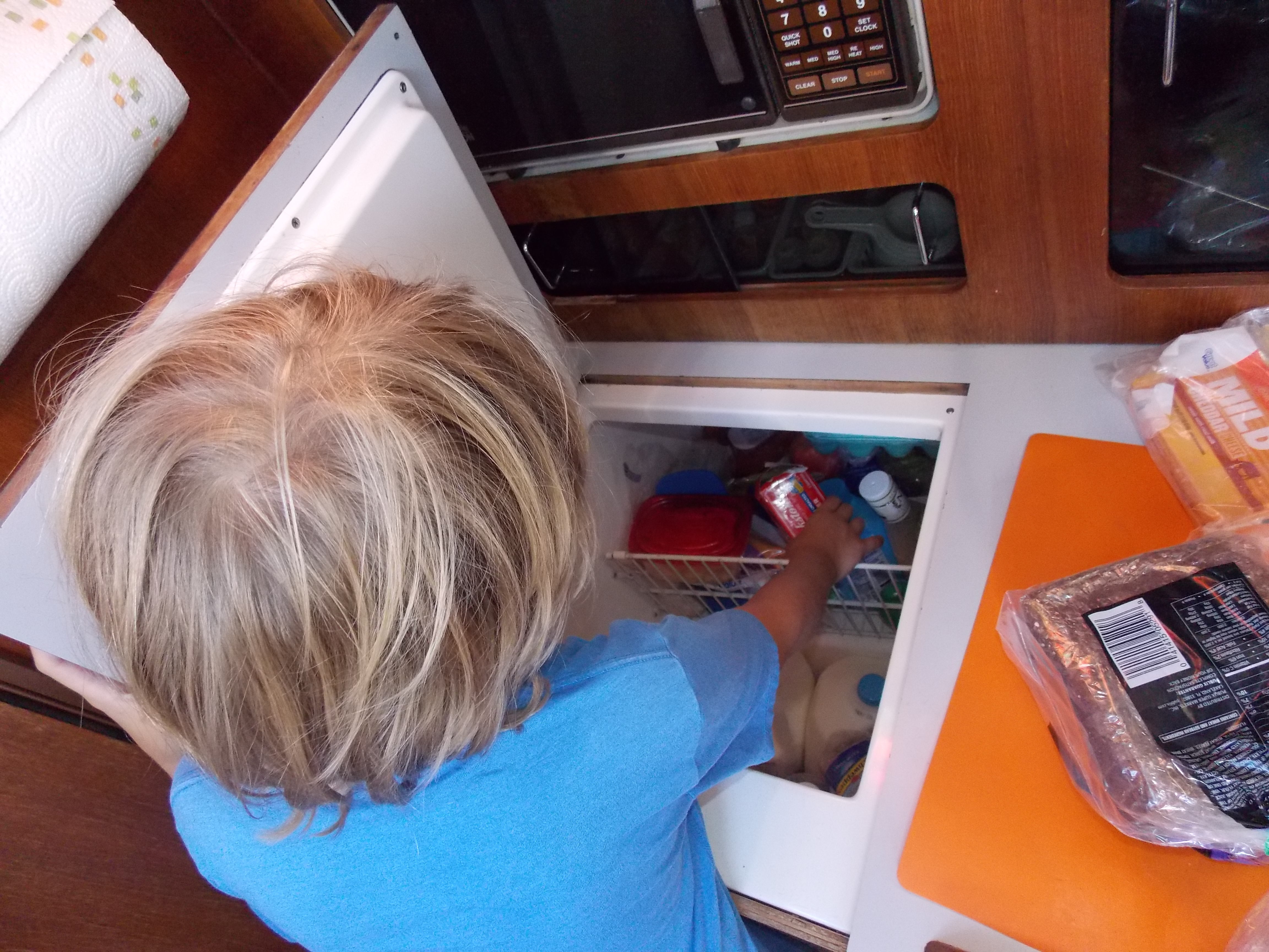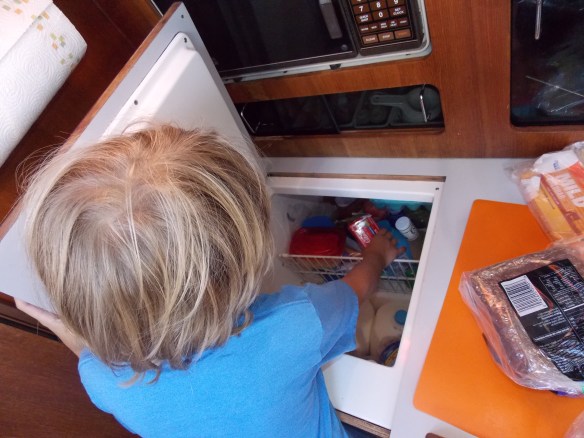 Yesterday, Christine finished whipping the anchor line and we started provisioning for the trip. We bought about $300 worth of canned goods at Wal-Mart. The boys wrote the names of the contents on all the cans just in case we lose the labels in the bilge. We completed the task of clamping 2 boards between the stations where we will attach extra fuel and water jugs.