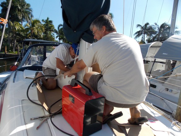 Our friend Lee came out to our boat yesterday and today. We have been replacing a homemade navpod with the real deal. Monday when Jason from Nance and Underwood came out to work on our reefing system we discovered one of the supports for the running rigging was missing where it attached to the base of the mast. It had broken at some point in the past. Lee welded a new support back in place returning the brace to its former strength.