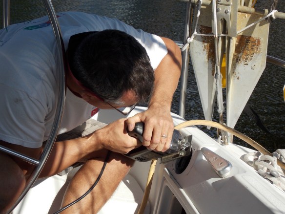 After two days we completed the work on the new navpod. We relocated the auto pilot to the port side of the cockpit. I had to have a new bar fabricated to hold the navpod. The work was done by Stuart at JTL Marine Engineering. He did a great job bending the new bar for us, it was a prefect fit. Lee was a big help working on the navpod and moving the autopilot to say the least. It was like the cavalry had shown up when he arrived with a welder and tools in hand.