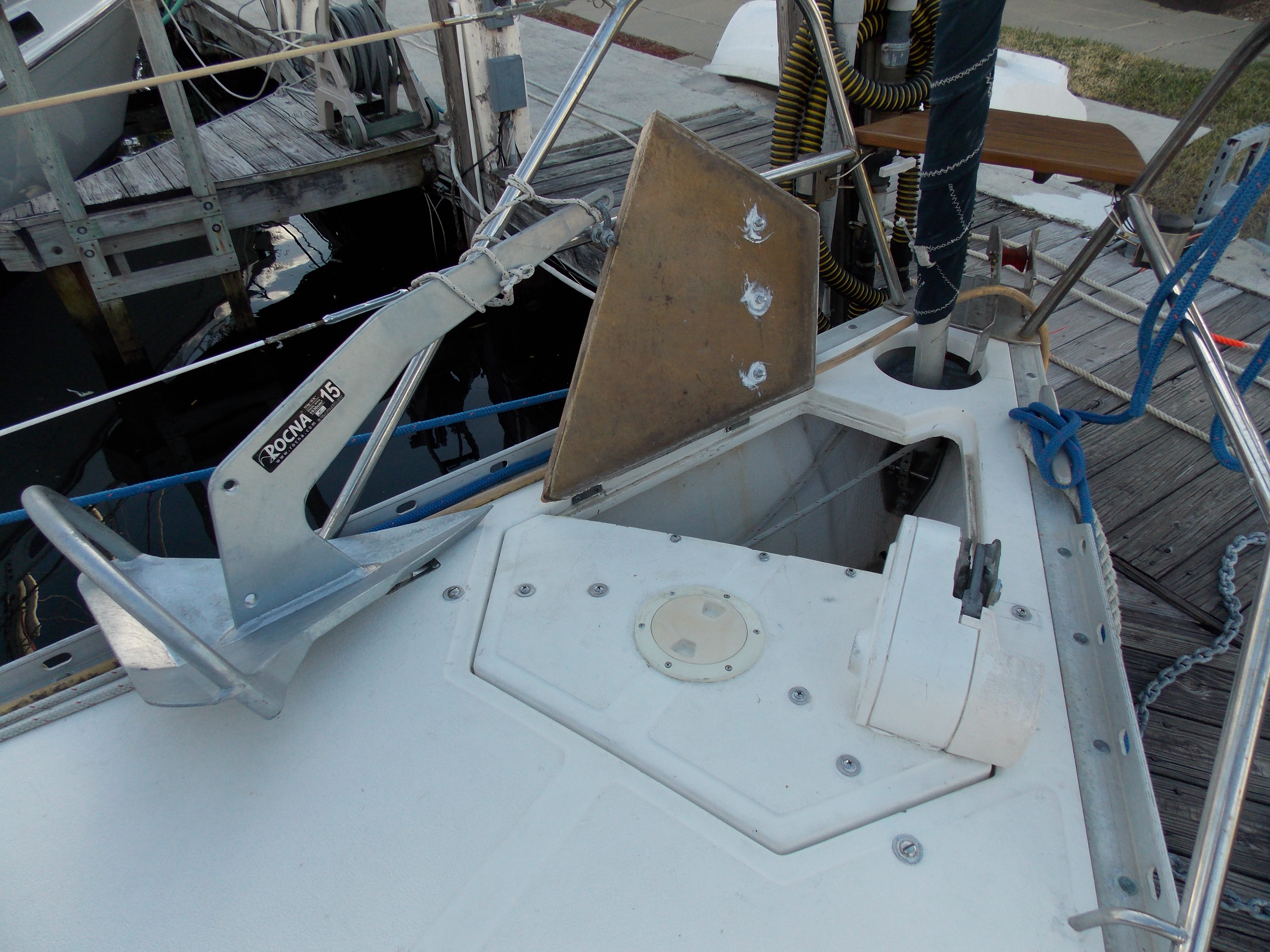 The door of the anchor locker was another project, which took some time to find a solution to. When we bought the boat, it had a windlass mounted to the locker door but the door wasn’t mounted to the boat. My solution, was to cut the door in half, hinge one half for access to the locker, then permanently mount the other half with the windlass to the boat. Since the windlass would be putting a great deal of strain on the door, its attachment needed to be robust. I used 2 stainless steel bars through bolted to the deck and a piece of aluminum angle iron to anchor the door at 3 points on the deck and to keep the door from flexing when you walk on it.