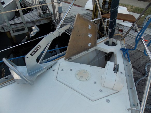 I finished the work on our engine hoist yesterday. Essentially, I mounted an L-shaped bar upside down and next to the outboard on the stern. The bar rests on a flange that allows it to rotate the outboard over the side of the boat and be lowered to the dinghy using an old mainsheet pulley system that we brought with us from Idaho. A couple of U bolts keep the bar firmly against the stern rail but not so tight that you can’t rotate the bar. At $85.00 it was a low-cost, low-tech solution to moving our outboard to and from the dinghy.
