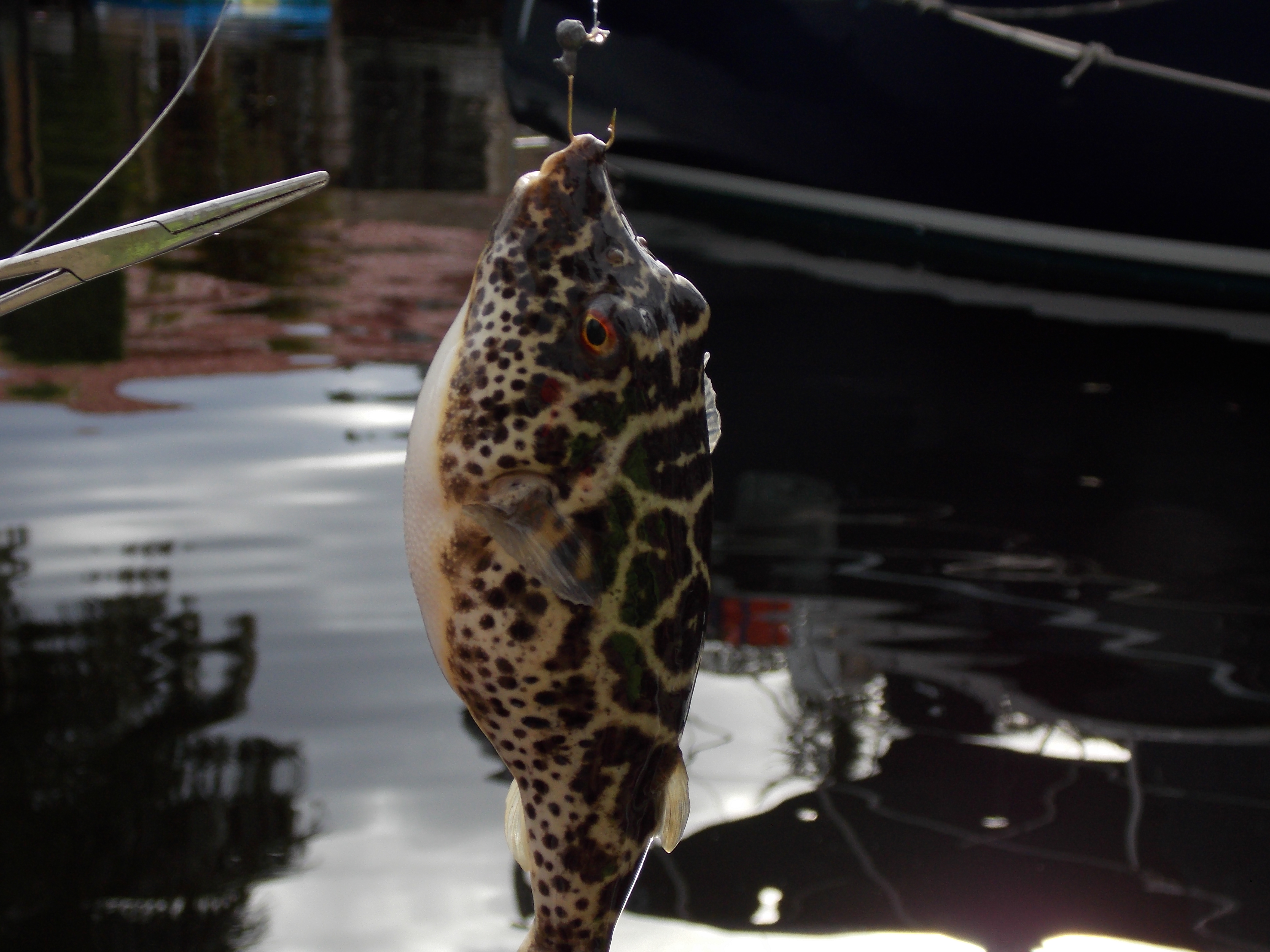 This morning Cole caught a Checkered Puffer Fish at the dock. He was using a piece of shrimp on a jig head. The puffer had 4 little bony teeth, 2 on the top and 2 on the bottom and he puffed up when we took the hook out to let him go. They are very comical looking fish.