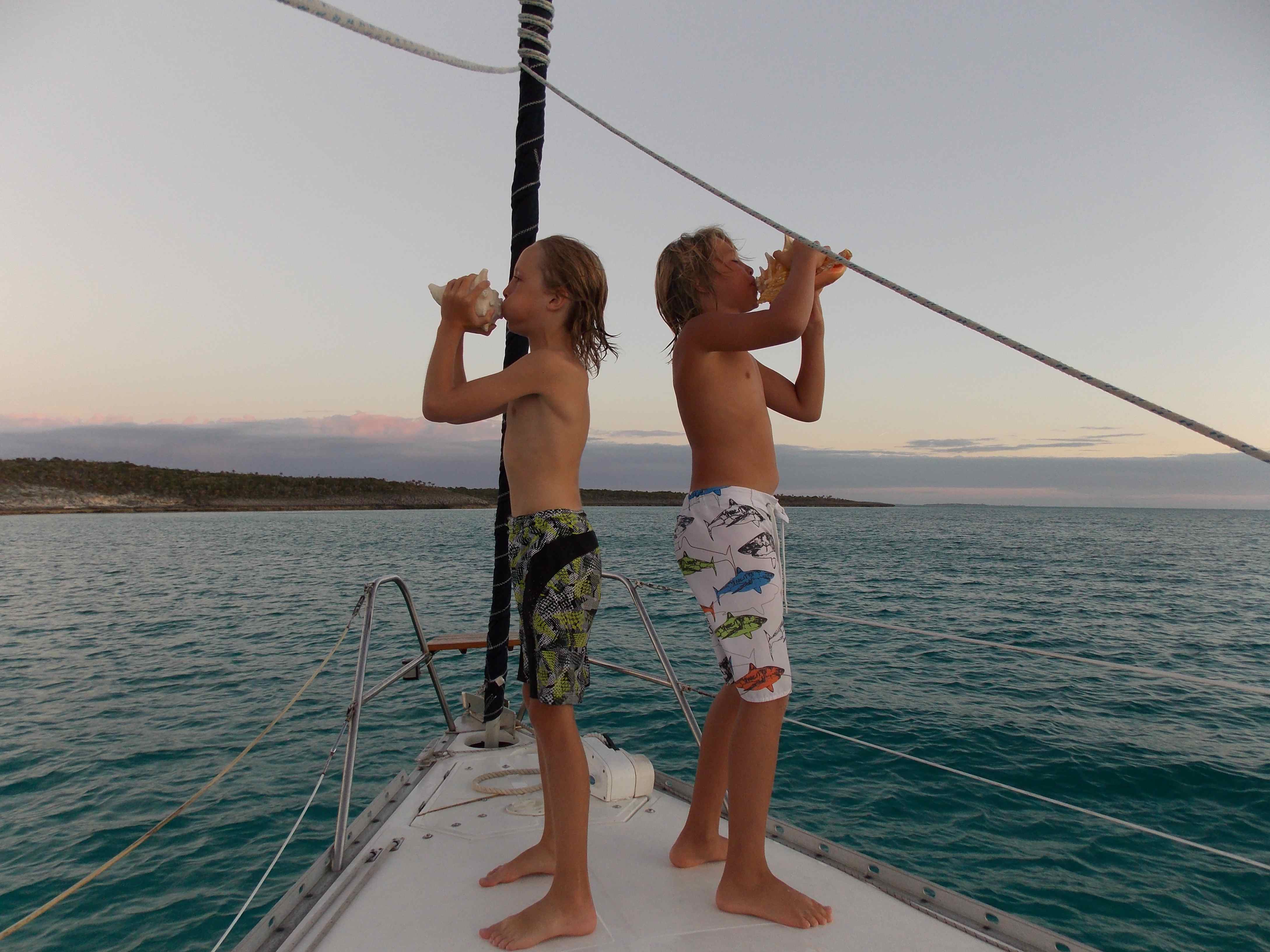 Blowing of the conch shell is a tradition at sunset. This is the conch Mark caught a few days ago. The shells all make a different sound. It is somewhat like an elk bugling.