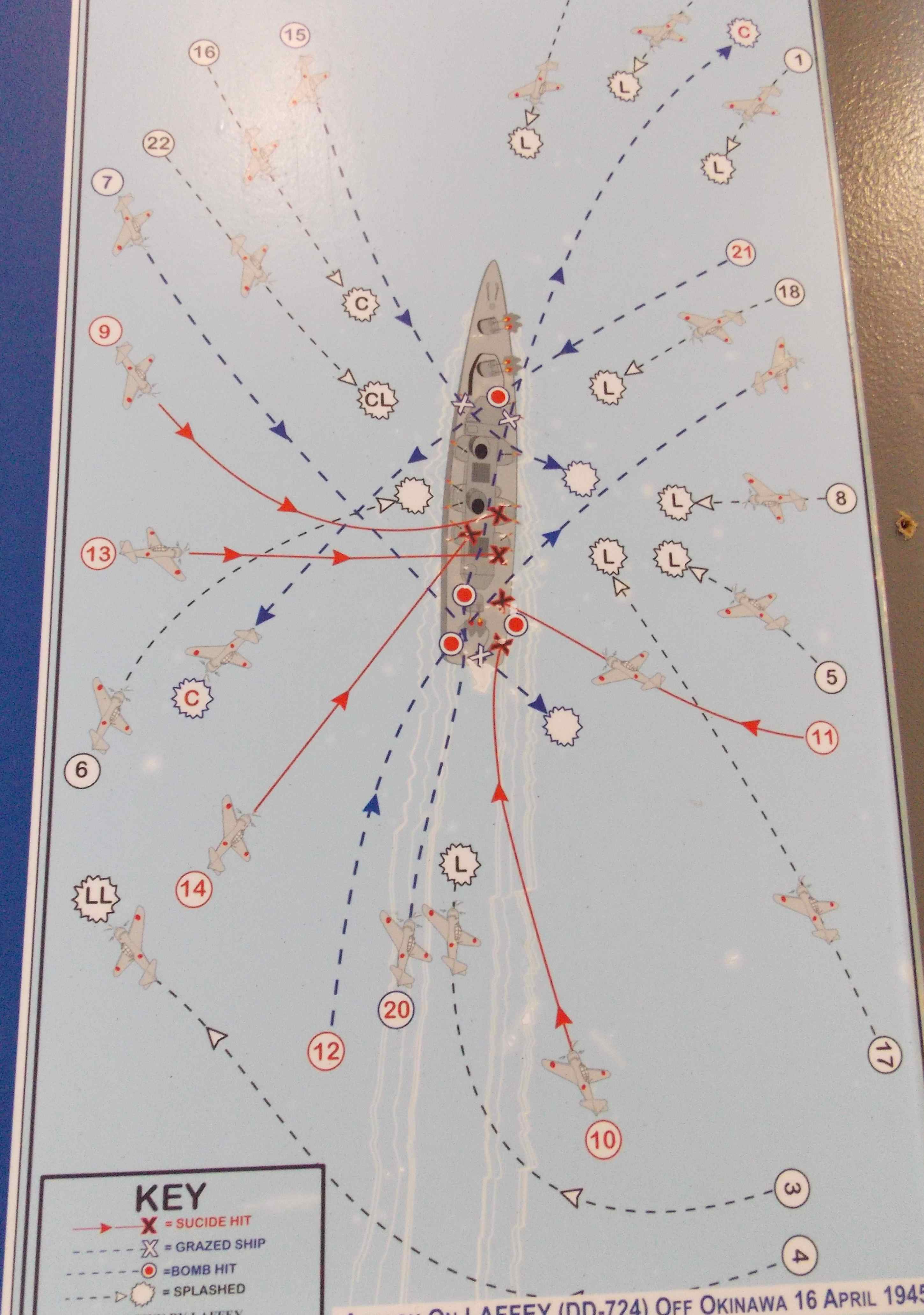 The destroyer we saw was named the USS Laffey. The Laffey was hit by 5 kamikazes and 3 bombs but it stayed afloat. When the Laffey came into port, the navy repaired her. It was 376 feet long, could go 34 knots, and its range was 6,500 nautical miles at 15 knots.