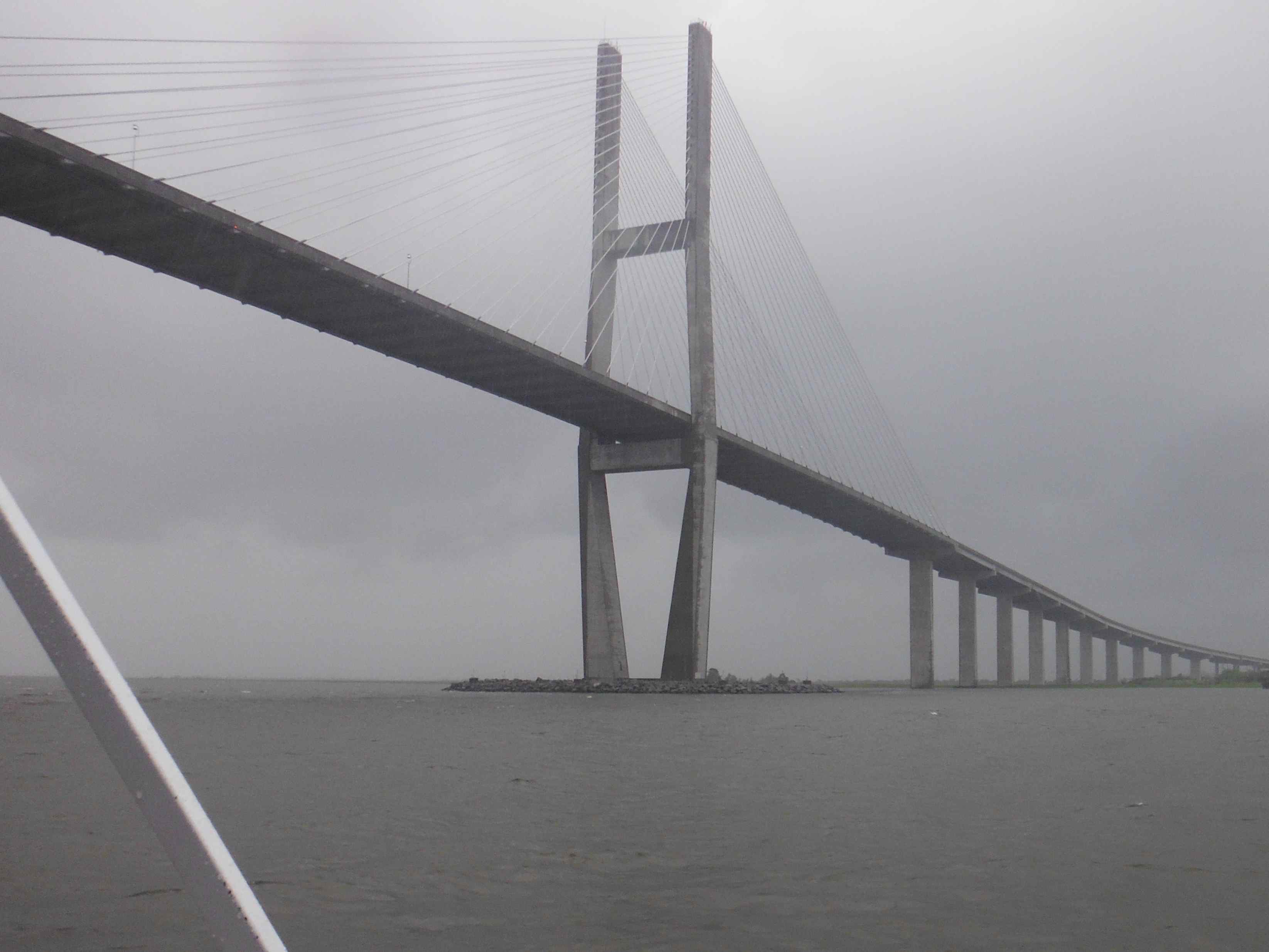 Sailing under Sidney Lanier Bridge in Brunswick, Georgia ahead of Tropical Storm Andrea.