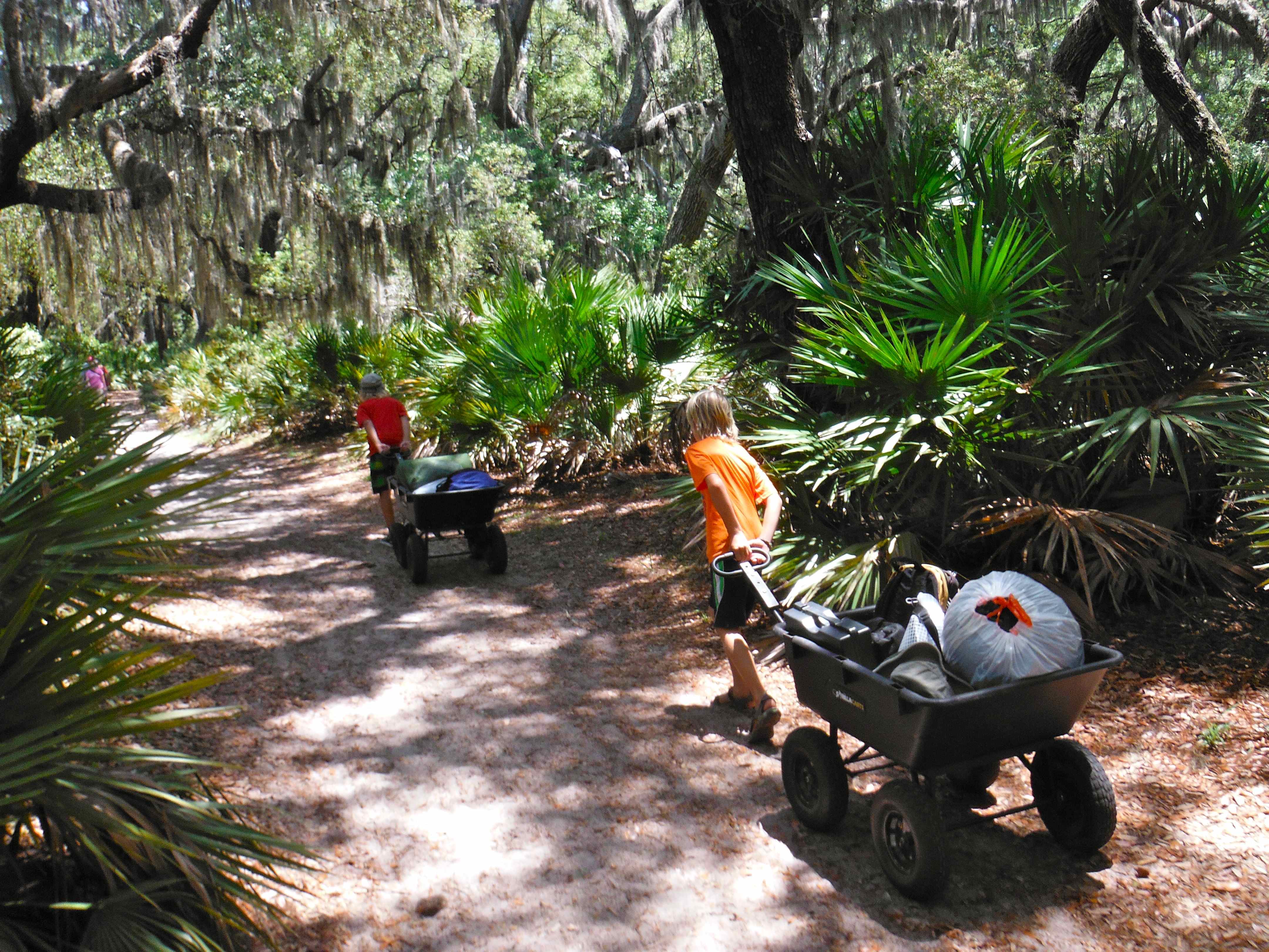 The boys wanted to go camping on the island so they loaded up the carts and trekked down the trail to Sea Camp.