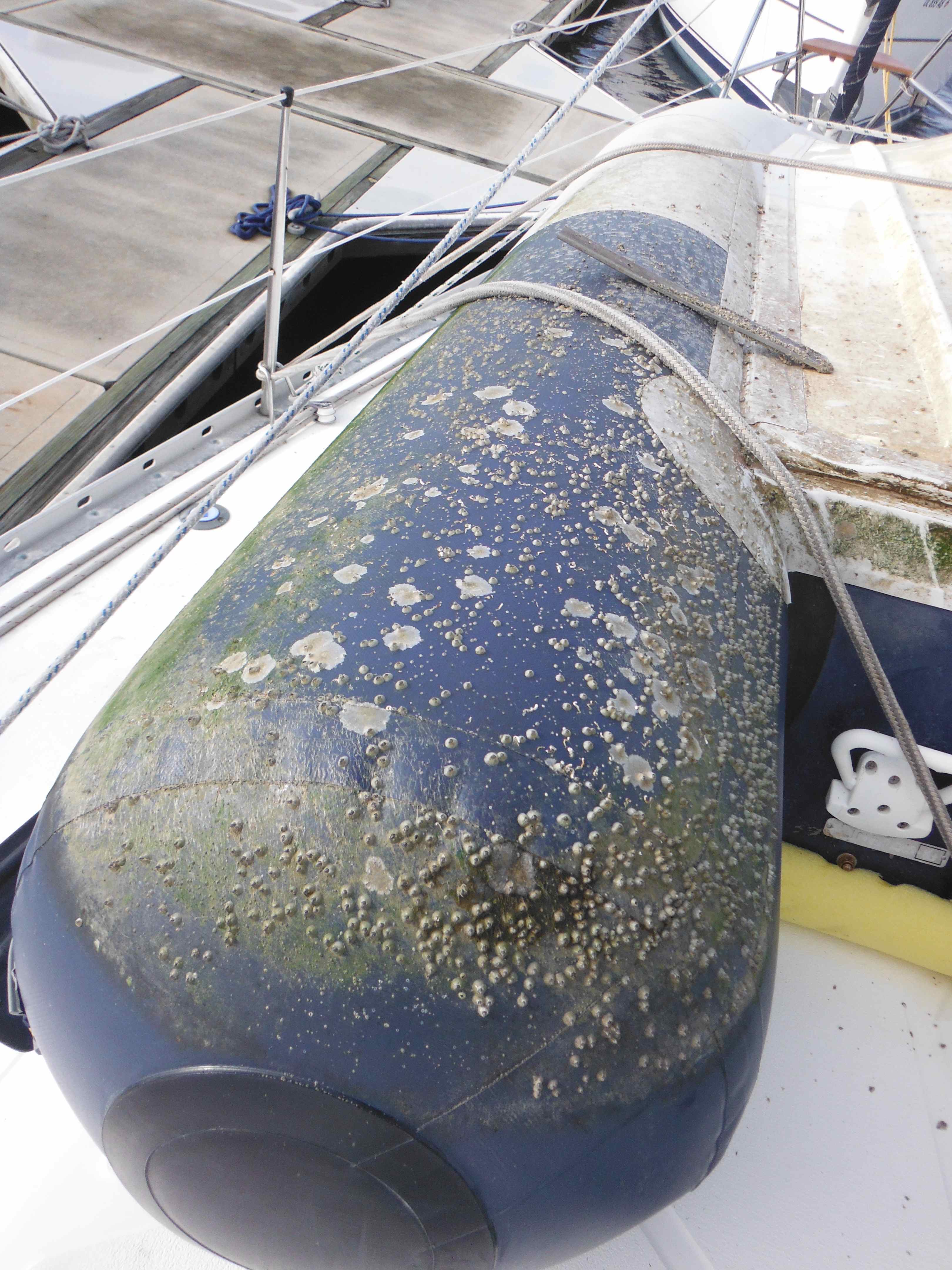 Barnacles on the bottom of the dingy.