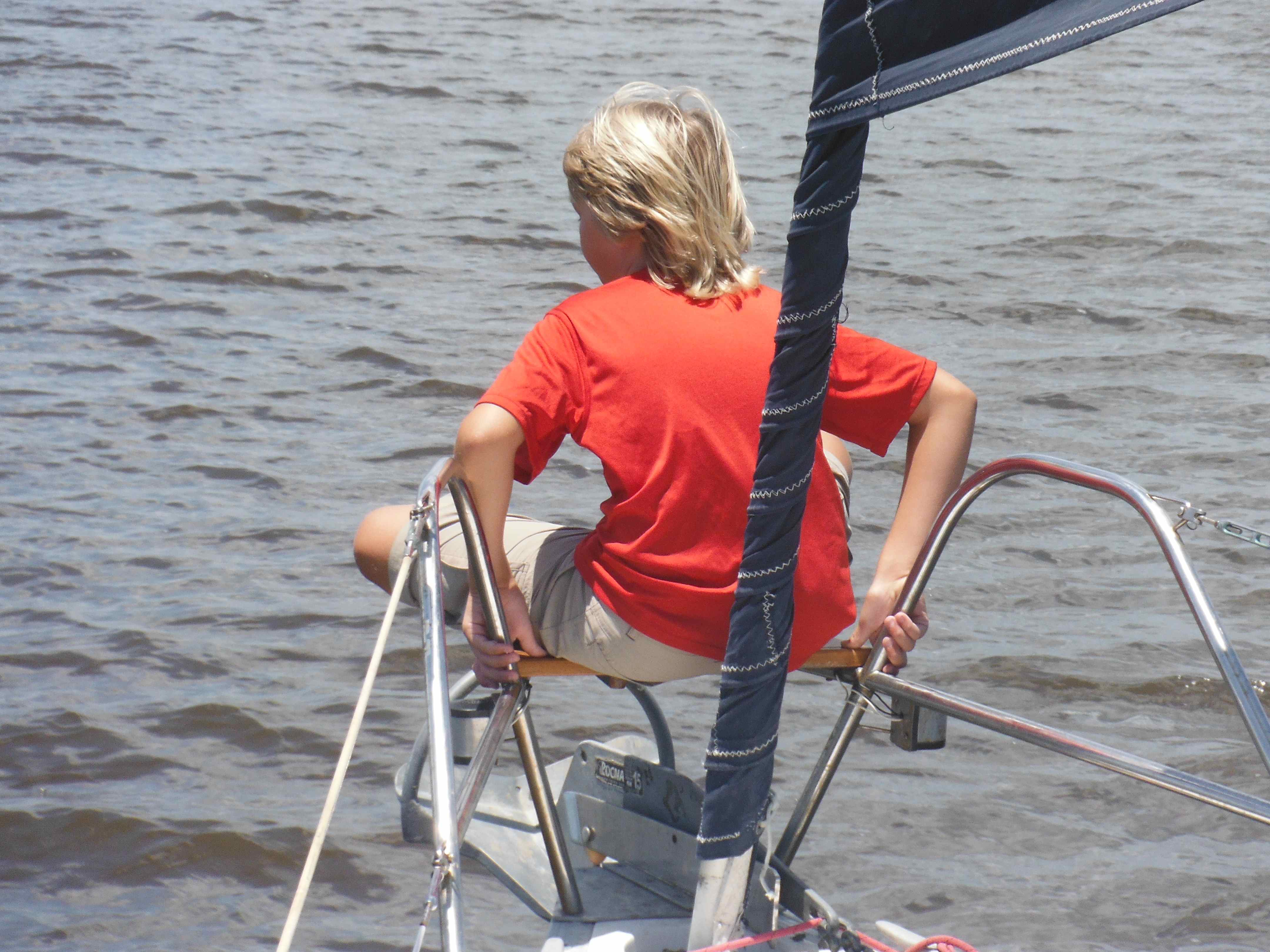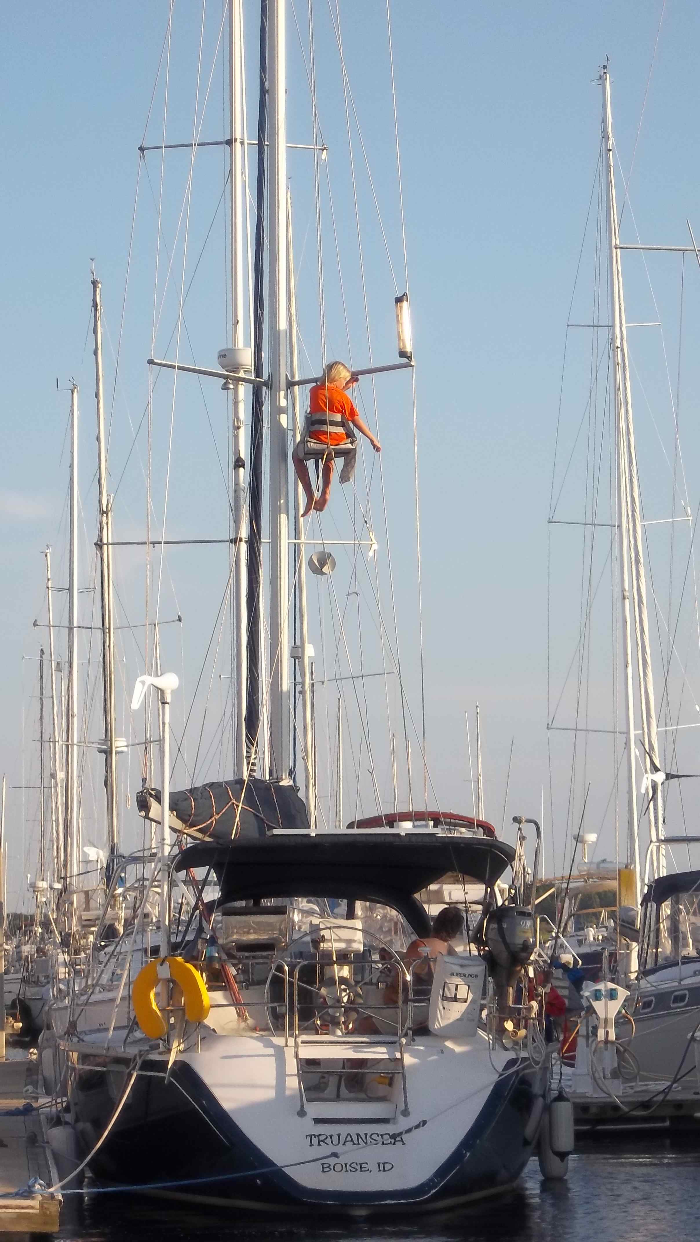 As always, there are boat projects to do. One of them was to replace the flag halyard. The boys love going up the mast. We borrowed Wind Dust’s bosun’s chair.