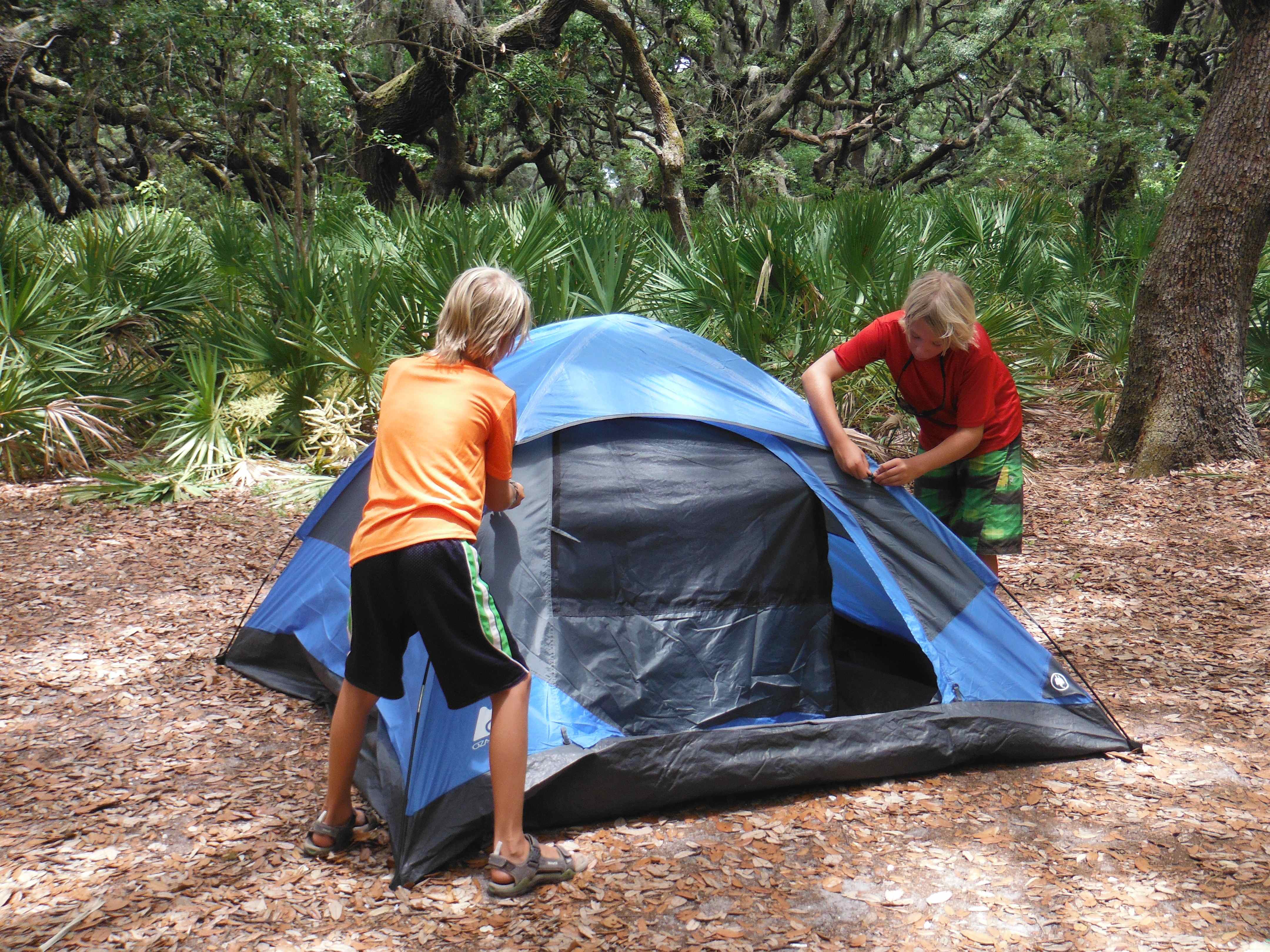 Logan and Cole setting up their tent.