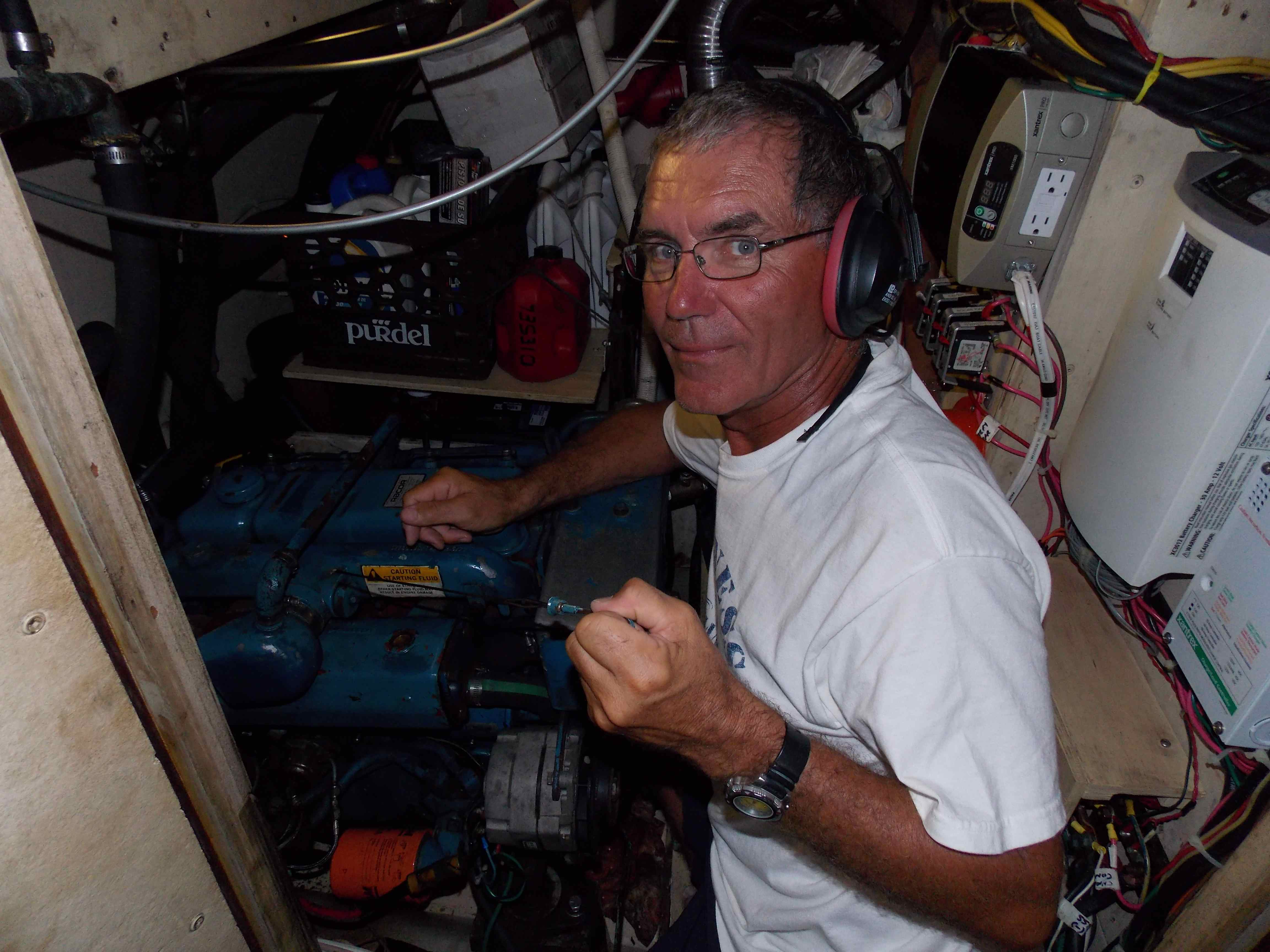When it came to maintenance of the engine, I opened and inspected the heat exchanger before we left the dock. I replaced the raw water impeller, belts and fuel filters. The fuel tank was polished to remove any sediment that might get stirred up in high seas. In retrospect, some of the fuel in the Bahamas was dirty and it would have been nice to have a baja filter for fueling. Because my fuel filter was rather small, I changed the primary filter every 100 hours along with the oil. In place of a Baha filter, I sacrificed an old t-shirt to filter the fuel going into the tank.