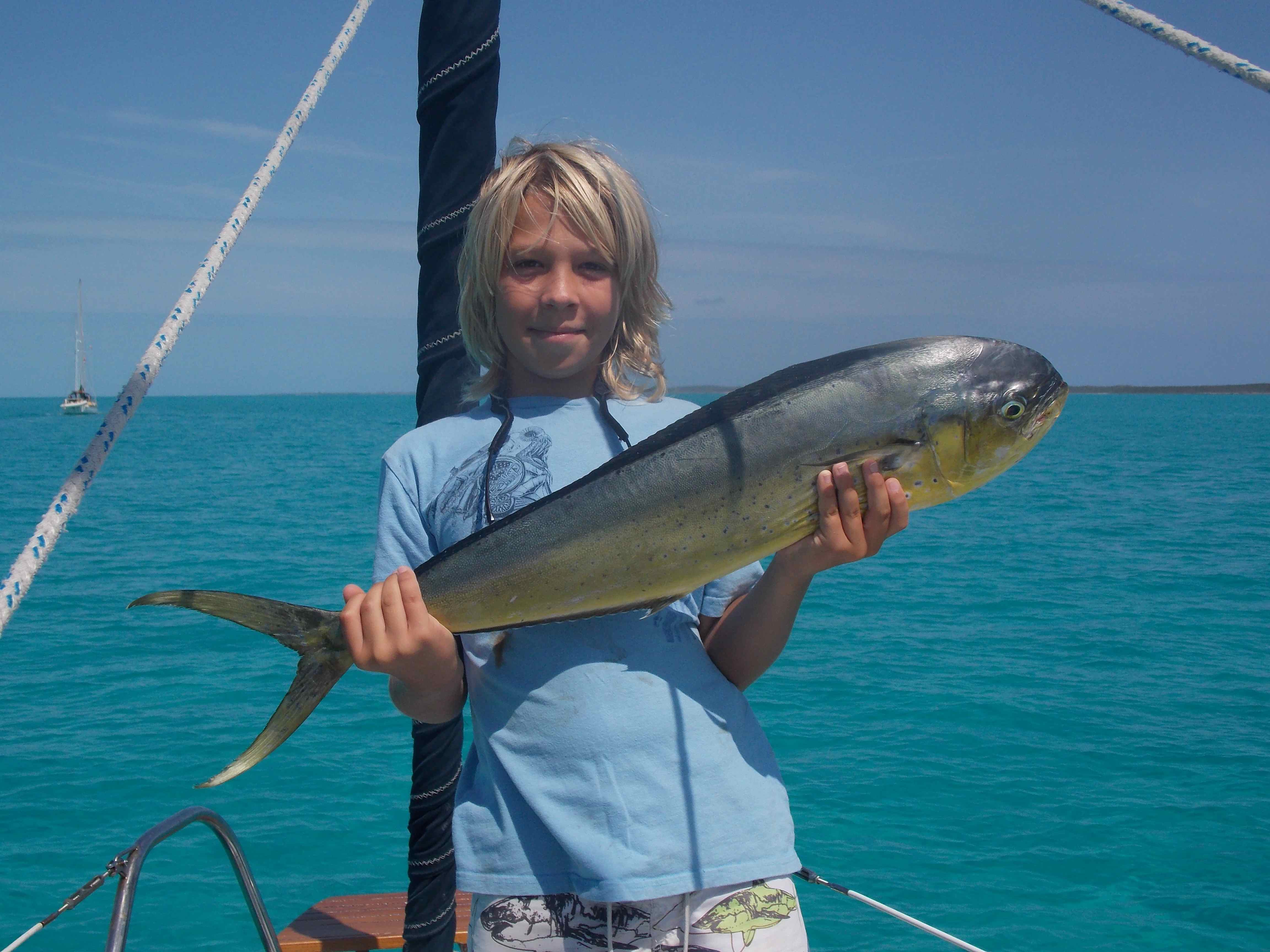 The second fish we caught was a mahi mahi. We were just sailing and one jumped beside us and a few seconds later our lines had a hit. One got away but we got the other one. He was about 3 feet.