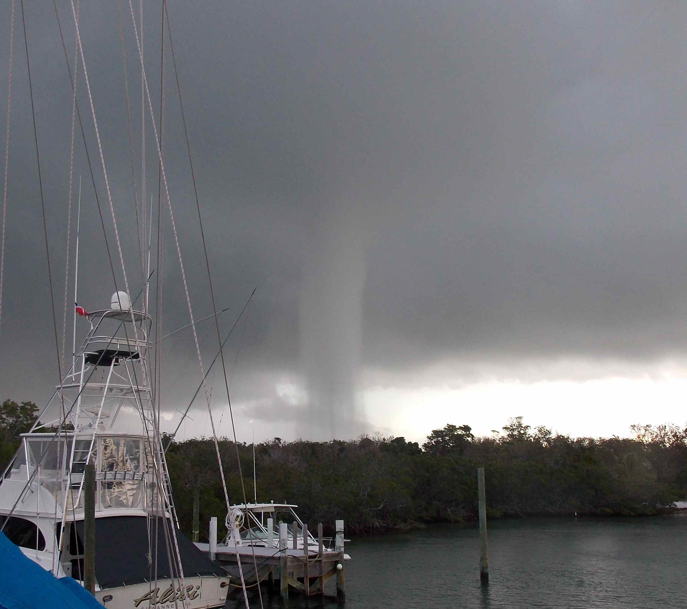 The waterspout started getting closer and looked like it was coming over the land toward us. Our boat neighbor Dave and his crew, Dennis, was with us at the time. Dave said, “Let’s get in my boat. Now.” We moved on to his boat which was heavier and more stable.